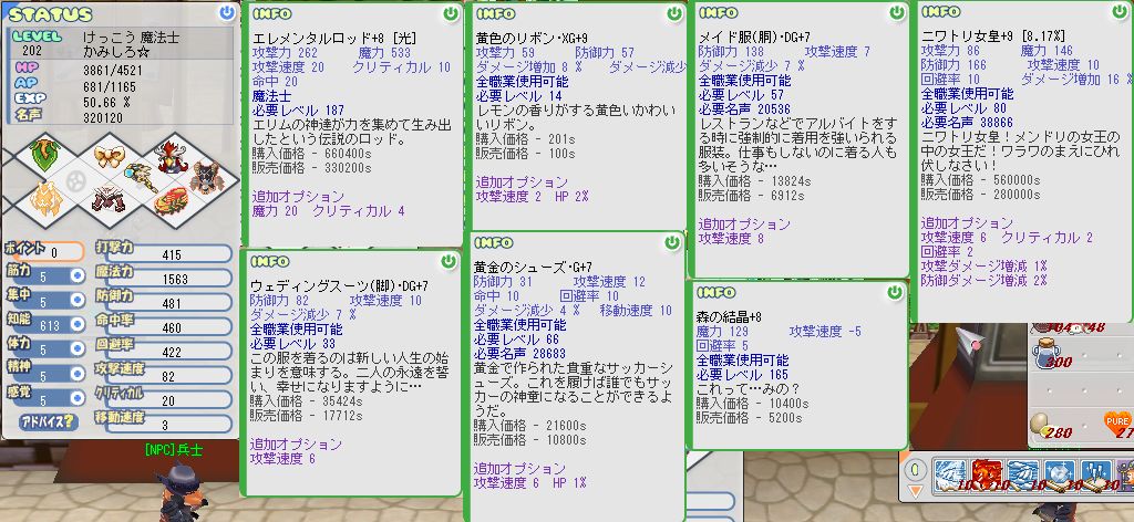 軽く雪積もってるしΣ(・口・) 暖かくなるならささっと暖かくなってほしいのにー(´・ω・) [sealの話] いつから狩り始めたのか忘れちゃったんですけど、DDでのドロップが それなりの数になってきました('-'*三*'-') うろ覚えで、 1.セイントブレード 2.光明ブーツ 3.降竜昇天 4.無影のハチマキ 5.無影のハチマキ 6.鍛冶士の靴 7.光明の鎧(胴) 8.セイントブレード ってトコかな。出すぎ('-'*三*'-')? 3/8の確率で武器ってけっこーおいしいんでしょうけど、セイント2本ってとこが 納得イカネー(*ノェノ)w ぽろぽろ出るから価値なくなっちゃうんだよねぇw あ、ちなみにこれ全部、青タンとDウォリアーから出てます(゚ロ゚;) それ以外のバイルもそれなりには狩ってるんだけどねー。 そうそう、魔法士がLv200超えました。真珠ももうLv170です。 ってことで?記念に魔法士のパラと装備品でも晒しちゃいます∑('◇'*)エェッ!? こんなかんじ。ちょっち貼り方が汚いのはご愛嬌(´ー`)y━~~ 見ての通りの極魔なんであんまし面白くはないですよね(*'ー'*)ふふっ♪ 極魔にしてはまだまだ装備品に不安が残りますけど、それでもついてるOPは どれもなかなかのものじゃないかなと自負しております(`・ω・)b とりあえず、目標だった黄色リボンXG化と+9化が順調に成功したので、 次は黄金靴のDG化をまったり目指しますっ。 最終的には防具全部XG化!・・・出来るのかな…c(゚^ ゚ ;)ウーン まだ補助は残ってるけどもっ。けどもっ。G書がナイ(*ノェノ) 戦闘できない鍛冶士でがんばるかなぁ(=゚∇゚)ボー んじゃまたそのうち(((((*'-')ノシ