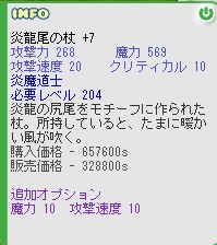実装されてる杖の中で最も必要Lvが高いだけあって超高性能(`・ω・) あとは追加おpだけ~ってことで、いざ余ってたマルコを頼りに鑑定の罠へ(-ω☆)キラリ 結果。 以前のエレ杖とは比べ物にならない超おpキターΣ(・口・) 高Lv装備にまさか速度10とはっ(*ノェノ) しかもオマケで魔力10なんて無難なものまでついてっ(*ノェノ) これはすべての運を使い果たしたにちがいn( ´△`)アァ- それはおいといて、あとは+9にしたいなーと思ってはいるんだけど Lvが足りない罠なわけで。 かといってLv上げるのももう一苦労な罠なわけで。 もうしばらくこのままでいいやー('-'*三*'-') 装備はけっこーイイカンジなんだけど、どうにもLv上げがマゾすぎてなかなか魔法士動かせてないなー(=゚∇゚)ボー ま、そのうちそのうちヘ(-.-ヘ;)... コソコソ... んじゃそゆことで(((((*'-')ノシ PR