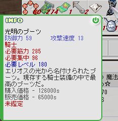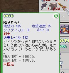 電源入れてしばらくすると、青い画面になって勝手に再起動。 それを2回ほど繰り返すと窓が立ち上がらなくなっちゃう。 (-ω-;)ウーン。どこだろ。マザボ?メモリ? 直すにしても買うにしても先立つものがー。。。あるけど!あるんだけども!! 今の私の状況下で余計なお金は使いたくないってのが超本音( ̄b ̄) シーーッ!! [sealの話] さてさて、シールでの目標が一杯あるんですけどもっ。 エレ杖ゲットとか、防具全部G化、DG化とか、Lv上げとか。 そのうちの一つ、エレ杖ゲットがついに実現しました(*^◇^)/゚・:*【祝】*:・゚\(^◇^*) 以前から暇にまかせて狩ってた青いタイタンスカル。 通称青たん。 イケイケで狩ってたら青たんがポロっとエレ杖を!! なんてことはありません(´ー`)y━~~ぉ ドロップテーブルに載ってない物落とすわけないです(*'-')b 代わりにこんなの落としてくれましたΣ(´□`;) 狩り開始してから30分経たないうちにでましたよ! やっぱ狩る時間とかじゃなくて運なんだなぁと実感(*・ω・)(*-ω-)(*・ω・)(*-ω-)ウンウン♪ 洒落じゃないので悪しからずっ。 しかしまぁ・・・。降竜昇天ってケッコー出るんでしょうか(;'-')? 露店で2本ほど並んでるのみたし、何よりも私の所属するギルドだけでも既に出してた人が二人もΣ(・口・)!? 私で3人目(;´▽`A`` まぁ何にしても魔法士である私には必要ないことこの上ないんですよねー( ´△`)アァ- なのでささっとシルコミュさんとこで交換希望だしちゃったんですけど、 一日待たずにレスついてました(*'▽'*)わぁ♪ そして手に入れた念願のエレ杖♪ ラジ杖に比べるとスッキリしてる。 見た目はラジのがイイというかスキ(*´ -`)(´- `*) でもでも、威力はラジDGよりもあきらかに↑Σ(・ω・ノ)ノ! 素晴らしい( ̄¬ ̄*) んで早速鑑定してみたんですよぉ。 攻撃力+20とか(*'▽'*)わぁ♪ ヽ(`д´#)ノ魔法士いじめかー! はい、ギルメンさんから「おめでとーw」いただきました(`ヘ´) フンダ!!! んでも!ここで終わらないのがこの私! 数回のマルコの後、なんと魔力+20が付きました(〃∇〃) てれっ☆ こっちは「おめでとー!」いただきましたv( ̄ー ̄)v 調子に乗って、G化宣言したいとこですけどね・・・。私の財力じゃ当分無理(´・ω・)b あと欲しいものって言ったら~、黒リボン速度OP付きかな。 これさえ手に入れちゃえば、ささっとG化はじめるんだけどねー;;;;(;・・)ゞウーン ま、これも目標のひとつってことで。 んじゃ今日はこんなとこで(((((*'-')ノシ